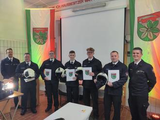 Fabian Benedetti, Paul Bischoff, Nils Krätzer, Sven Twardon und Markus Werle wurden vom Feuerwehrmannanwärter zum Feuerwehrmann befördert.