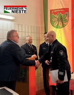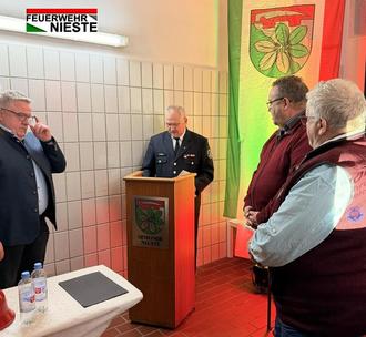 Jürgen Ewig und Peter Schäfer wurden mit der Plakette des Bezirksfeuerwehrverbandes in Gold für ihre 50-jährige Mitgliedschaft in der Feuerwehr Nieste geehrt.