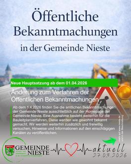 ab dem 01. April 2026 erfolgt die Veröffentlichung der öffentlichen Bekanntmachungen der Gemeinde Nieste auf Grundlage der Hauptsatzung ausschließlich digital.