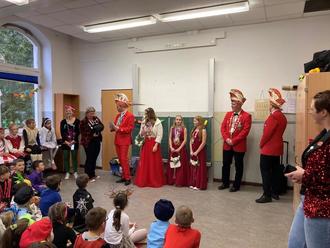 Das Prinzenpaar begrüßte die Kinder mit einer auf die Kinder zugeschnittenen Rede und natürlich mit einem dreifachen Nieste Helau. Gardetänzerinnen der Karnevalsvereine zeigten ein vielseitiges Programm, welches die Hoheiten sehen konnten. Am Ende gab es noch eine kleine Überaschung: Der Karnevalsverein brachte den Kindern Geschenke mit, über die sich die Schulgemeinde sehr freute, denn mit den Bällen und Federballschlägern haben die Kinder in den Pausen viel Freude. Ein anschließendes Gruppenfoto, sowie das Steigenlassen von Luftballons rundeten diesen besonderen Besuch ab.
