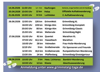 Der „Startschuss“ für die Anmeldung zu den GrimmSteig-Tagen 2026 ist gefallen. Ab Anfang Dezember 2025 ist das Anmeldeportal für eine der größten Wanderveranstaltungen in der Region geöffnet. Das Streckenangebot geht erneut von der Wanderung für Senioren von knapp 2 km über die Bambini-Wanderung mit Frau Holle über 3 km bis hin zur ultimativen Herausforderung und nur etwas für erfahrene Hardcore-Wanderer, GrimmSteig XL mit über 125 km und dem Start ab der Grimmwelt in Kassel.