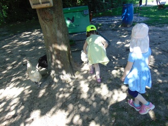 Gemeinsam mit den Erzieherinnen wurden die Hühner gefüttert, der Stall saubergemacht und die Hühnereier gesammelt. Damit die Hühner auch am Wochenende gut versorgt waren, haben die Eltern uns tatkräftig unterstützt. Auch abends kamen die Eltern vorbei um nachzuschauen, ob jedes der fünf Hühner seinen Weg in den Stall zurückgefunden hat.