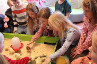 2,5 Wochen beobachteten wir das Aufwachsen der Küken, wie sie immer neugieriger, hungriger und auch frecher wurden. Nach nicht einmal zwei Wochen konnten die Kinder schon die ersten kleinen Federn entdecken. Unsere Küken freuten sich immer, wenn vor ihrem Gehege Trubel herrschte, was meist mit der ein oder anderen Leckerei verbunden war.