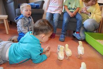 Anfang Mai haben uns unsere Küken in der Kita besucht und einen Vormittag auf der Wiese im Garten verbracht. Die Kinder haben festgestellt das unsere Vierzehn schon aussehen wie richtige Hühnchen. Nur eins, das Kleinste hat auf dem Rücken noch etwas Flaum. Nach dem aufregenden Vormittag gings wieder zurück auf den Bauernhof. Wir bedanken uns ganz herzlich bei der engagierten Familie, ohne die dieses Projekt nicht möglich gewesen wäre und freuen uns auf das nächste Mal.
