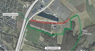 Die grüne Linie auf der Abbildung zeigt die neue, naturnahe Umgehungsstrecke und wie sie diese Route von beiden Ortsteilen aus am besten erreichen können. Die in unmittelbarer Nähe des Obelweges verortete Umgehung bietet, neben einem kaum merklichen Umweg, mehr Ruhe und Natur, eingebettet an den Waldrand des Rüstebergs. Die Strecke wird vor Ort ausgeschildert sein und Sie entlang des neuen Abschnittes begleiten. Denken Sie auch daran, dass die Verlängerung der Straße „Zum Solarwerk“, also der Trampelpfad in Richtung Obelweg, ab sofort wegfällt und nicht länger genutzt werden kann. Bitte nutzen Sie daher unbedingt die naturnahe Ersatzstrecke und sorgen für das kommende halbe Jahr für etwas Abwechslung auf Ihrer täglichen Route über den Sandershäuser Berg.