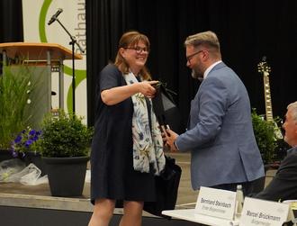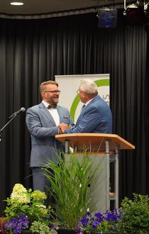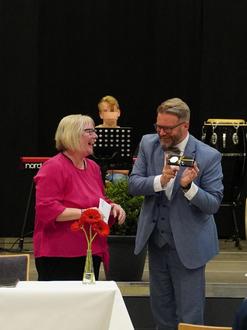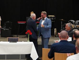 Silke Engler überreichte ein nützliches Schreibset. Das letzte Geschenk des Landkreises war eine Krawatte, doch Brückmann trägt nur Fliegen. Das wurde nun mit Erfolg bereinigt.