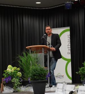 Höhepunkt des Abends war die herzliche Antrittsrede von Marcel Brückmann, in der er seine Verpflichtung als Diener der Gemeinde authentisch untermauerte. Hier rezitierte er u.a. seine Rede zum 900. Jubiläum seines Heimatortes Heiligenrode, die er jedoch auf alle Niestetaler umschrieb: „Niestetaler sein muss man wollen, man muss sich einbringen und dann ist man das.“ Er will seine Kommune weiter voranbringen, den Diskurs fördern und mit gutem Beispiel vorangehen. Niestetal sei eine Gemeinde der Vielfalt, der Toleranz und des Engagements. Man solle nicht vergessen, was man hieran hat und auch, wenn man es nicht allen Personen recht machen kann, dürfe dies nicht zu einer Entzweiung führen. Er sei stolz ein Niestetaler zu sein und ruft alle auf für die freiheitlich demokratische Grundordnung einzustehen. „Wir sind sehr privilegiert und leben in einem der großartigsten Länder der Welt.“ Das müsse geschützt werden, vor allen gegenüber Gruppen, die dieses System beseitigen wollten. Großes Lob ging auch an die 250 Mitarbeitenden der Gemeinde, die Gremien und an die Bürgerinnen und Bürger, die Niestetal mit Leben füllten. Vor allem hob er hier das Feuerwehrwesen, die Schulen, Kindergärten und alle Vereine und Verbände hervor. Den größten Dank sprach er seiner Familie sowie seinen Freunden aus und da floss dann auch die ein oder andere Träne, denn sie seien es, die am meisten unter den langen Arbeitszeiten zu leiden hätten. Zum Ende dankte er für die teilweise jahrzehntelange Treue und Unterstützung.