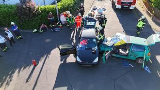 Simuliert wurde ein seitlicher Zusammenstoß zweier Fahrzeuge, in einem Kreuzungsbereich im Wohngebiet. In den PKWs saßen in Summe drei verletzte Personen, die realistisch geschminkt worden waren und dementsprechende Verletzungen simulierten.
