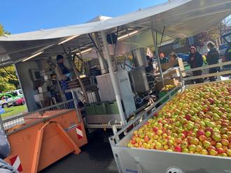 Letzte Möglichkeit Saft pressen zu lassen beim großen Apfelfest am Freitag, dem 19. September 2025, vor dem Rathaus (Pressen sogar schon ab 7 Uhr)