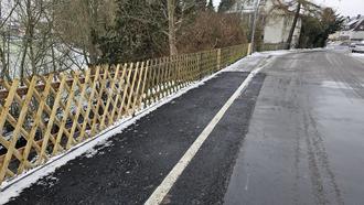 In diesem Bereich muss einerseits die Böschung gesichert und andererseits der Gehweg verlegt werden, da die Fahrbahn im Einmündungsbereich zudem verbreitet werden muss. Vorhandene Kabel und Leitungen erschweren in diesem Bereich die Anordnung der Stützkonstruktion.