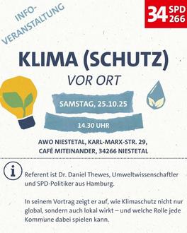 Der SPD-Ortsverein Niestetal lädt alle Bürgerinnen und Bürger herzlich zur Veranstaltung „Klima(schutz) – vor Ort“ ein.