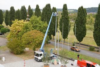 Nachdem die Gemeindevertretung bereits im Haushalt die Anschaffung der Systeme beschlossen hatte, wurden in den letzten Wochen insgesamt sechs Sirenen an etwa 12 Meter hohen Masten installiert. Ausnahme hierbei bildet der Mast am Sandershäuser Berg. Dieser misst 14 Meter, um die Lautstärkevorschriften auch dort einzuhalten. Die übrigen Standorte findet man am Rathaus neben den Fahnenmasten, am Parkplatz Cornelius-Gellert-Straße und am Spielplatz Opfertriesch in Heiligenrode sowie am Friedhof und in der Egon-Höhmann-Straße in Sandershausen. Die Lautstärke der Anlagen beträgt dabei mindestens 101 dB in 30 m Entfernung, sodass wir auch die vorgegebenen Förderbedingungen einhalten. Diese sieht eine Unterstützungssumme von etwa 25.000 Euro vor.