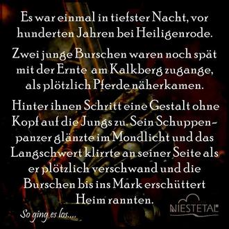 Unsere wichtigste Sagenfigur, eine schauerliche Rittergestalt ohne Kopf, stapfte in der Nacht durch Feld und Flur und jagte den Menschen einen gehörigen Schrecken ein. Meist wollte er den Menschen etwas gutes tun, aber er spielte ihnen auch viel Schabernack.