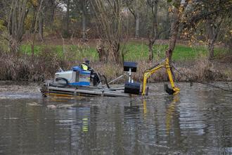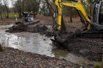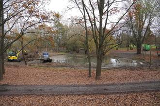 Bei den oberen Teichen wurde diesen November nun der Wasserstand leicht abgesenkt, das Schilf im Teich geschnitten, die Gehölze am Ufersaum zurückgenommen und hunderte Baggerschaufeln an schlammigen Ablagerungen entnommen. Die durch die Arbeiten in Mitleidenschaft gezogenen Wege werden in Kürze wieder zu Begehung hergerichtet. Eine endgültige Beseitigung der Schlammpfade und Wiesenfurchen, die Entsorgung des angefallenen Teichschlammes und die Sanierung der Wege erfolgen im Frühjahr. Dann wird auch das Schilf im Ufersaum wieder Grün ansetzen und aussprießen. Außerdem mussten keine Tiere umgesetzt oder unnötigem Stress ausgesetzt werden, da die Arbeiten minimalinvasiv für die Tierwelt durchgeführt wurden.