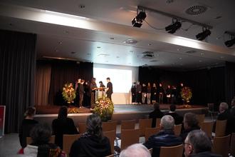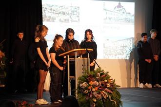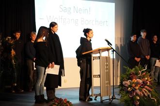 Frau Homann, die stellvertretende Schulleiterin der WLS, leitete in die Hauptveranstaltung über und begrüßte gleich die Schülerinnen und Schüler der WLS, unter der Leitung von Herrn Hödl. Gemeinsam wurden eindrucksvoll Texte und Gedichte rezitiert und in einen modernen Kontext gerückt. Aus Kriegsberichten in Zeitungen und dem Radio wurde TikTok und Youtube. Die Kriege im 20. Jahrhundert vernichten genauso Menschenleben, wie der Krieg in der Ukraine und dem nahen Osten, die beide nur zerbombte Städte und Leid hinterlassen. Die alten Texte waren plötzlich zum greifen nah.