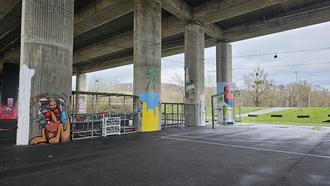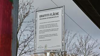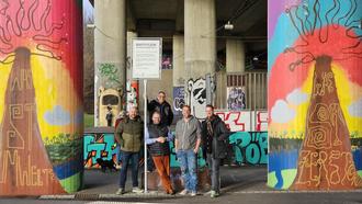Ab sofort darf frei und ohne Anmeldung Graffiti-Kunst im Säulenpark Niestetal gesprayt werden. Bürgermeister Brückmann und die Beteiligten des Säulenparks sowie des Vereins „Sport- und Kultur in Niestetal“ weihen das neue Hinweisschild unter der Autobahnbrücke ein.