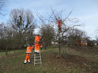 Am zweiten Termin gab es, aufbauend auf dem ersten Termin, eine Einführung zum Altbaumschnitt und anschließend wurden mittlere bis alte Obstbäume auf der Streuobstwiese am Park Heiligenrode geschnitten. Aufgabe war es, die Baumkrone aufzulichten, ohne zu viel rauszunehmen, damit wieder mehr Licht in die unteren fruchtenden Partien des Baumes kommt und auch dort der Ertrag gefördert wird sowie Misteln, die die Bäume schwächen, zu entfernen. Dies darf jedoch nicht durch einen Radikalschnitt geschehen, da der Baum darauf extrem reagiert und Verletzungen in einer gewissen Größe nicht mehr schließen kann. Auch hier wurde den Teilnehmenden vermittelt, auf was Sie bei der Pflege von Altbäumen besonders achten müssen.