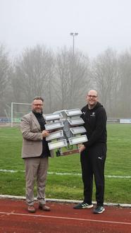 Bürgermeister Brückmann und Matthias Schmelz vom TSV Heiligenrode, Abteilung Fußball, freuen sich über die neuen Leuchtmittel. Die bereits montierten Flutlichter sorgen im Stadion für eine bessere und vor allem energieeffizientere Ausleuchtung.