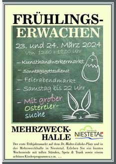 Frühlingserwachen heißt unser neuer Handwerker- und Frühjahrsmarkt. Zu erleben gibt es über 20 Kunsthandwerkerinnen und Kunsthandwerker, die Sie hauptsächlich in aber auch außerhalb der Mehrzweckhalle begrüßen und mit einem bunten Sortiment in Frühlingsstimmung bringen. Die Palette reicht von vielfältigen Deko-Artikeln, über Schmuck, Handarbeiten, Geschenkartikel, Seifen, Süßwaren, Spielzeug, Vogelhäuser, Keramik und Kerzen.
