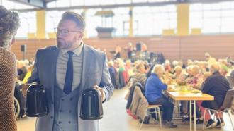 Nach einem Grußwort der katholischen Kirche ging es dann auch schnell zum angenehmen Teil des Tages, dem Schnuddeln bei Kaffee (natürlich koffeinfrei) und Kuchen. Beim Ausschank dabei waren auch Bürgermeister Brückmann und der Vorsitzende der Gemeindevertretung Herr Volker Hammermüller. Anwesend waren knapp 400 Leute von insgesamt 2090 eingeladenen Ü70ern aus Niestetal. Es wurden fast 200 Liter Kaffee getrunken und reichlich Kuchen verspeist. Die drei leckeren Sorten stammten von der Polizeikantine aus Kassel-Niederzwehren.