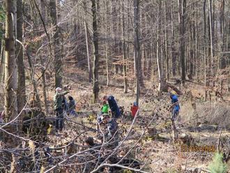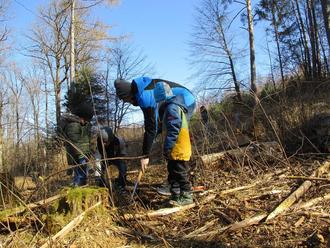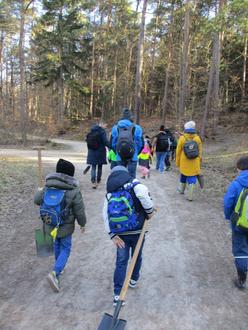 Herr Jörg, Revierförster dieses Bezirkes, begrüßte uns am Treffpunkt nahe der Königsalm. Dank der großen Bereitschaft der Eltern, uns bei unserem Vorhaben zu unterstützen, ging es im Konvoi in den Wald. Dort angekommen, liefen wir noch ein kleines Stück durch die märchenhafte Waldkulisse, hin zur Pflanzstelle. Nach einem kleinen Picknick und fachgerechter Einweisung fürs Bäume pflanzen ging es schließlich los.