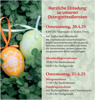 Sandershausen: 06:00 Uhr Osternachtsgottesdienst (mit Taufen und Abendmahl)