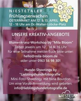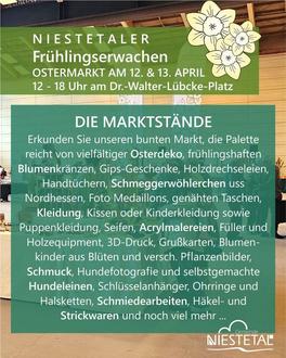 Seit 2024 veranstaltet die Gemeinde Niestetal einen Ostermarkt mit dem Titel "Frühlingserwachen" in Niestetal. Sie sind herzlich dazu eingeladen durch die Mehrzweckhalle zu schlendern oder auf dem Dr.-Walter-Lübcke-Platz bei den Food-Trucks die Frühlingsstimmung aufzusaugen.