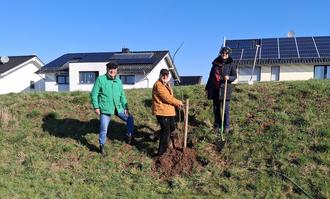 Die beiden haben nun Mitte März mit Hilfe von unserem Ersten Beigeordneten, Herrn Bernhard Steinbach, die mittlerweile stolzen sieben Jahre alten Walnussbäume am Eichberg in Heiligenrode eingepflanzt. Denn hier entsteht seit der Geburtsbaumaktion in 2020 schrittweise entlang des Hangs in der Ausgleichsfläche "Am Eichberg" ein Hain.