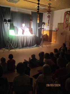 Anschließend trafen sich alle gemeinschaftlich im Turnraum, wo Jörg Dreismann vom TicTacTheater mit dem Stück “Die drei kleinen Schweinchen” auf uns wartete. Die Kinder waren fasziniert von der Geschichte und verfolgten voller Eifer, wie die kleinen Schweinchen sich gegen den bösen Wolf verteidigten. Die Aufführung wurde finanziert über die Elternspende - hierfür ein herzliches Dankeschön.