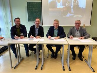 Bei der Unterzeichnung der Kooperationsvereinbarung zum Projekt Strahlemann Talent Company an der Theeltalschule Lebach (von links): Alexander Hübner (Projektmanager der Strahlemann-Stiftung), Thorsten Gand (Schulleiter der Gemeinschaftsschule Theeltalschule Lebach), der Saarlouiser Landrat Patrik Lauer und Michael Ipfling, Vorstand Globus-Stiftung. Foto: Landkreis Saarlouis/Ulrike Paulmann