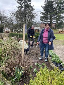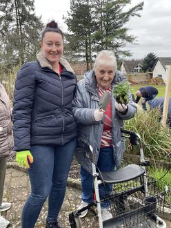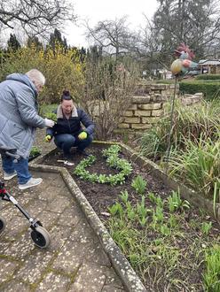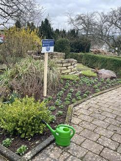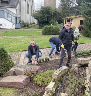 Gemeinsam mit Seniorinnen und Senioren des „Café Plauderstübchen“ haben Lebachs Bürgermeister Klauspeter Brill, der Steinbacher Ortsvorsteher Jörg Wilbois sowie Claudia Köhler und Ute Groß vom Sachgebiet Jugend, Frauen, Senioren der Stadt Lebach jede Menge Vergiss-Mein-Nicht-Stauden im Garten zwischen der Pflegeeinrichtung und der Pfarrkirche gepflanzt.