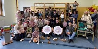 Mit einem Lied und zwei selbstgebastelten Dartscheiben bedankten sich Kinder, Erzieherinnen und Erzieher der Kita Aschbach im Beisein von Bürgermeister Klauspeter Brill (vorne re.), der pädagogischen Gesamtleitung Katja Wilhelm (hinten Mitte) und Ortsvorsteher Josef Nickolai (Bildmitte) bei Jonas Schmidt (li.) und Simon Müller (re.). Foto: Kirsch/Stadt