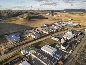 Blick auf das Lebacher Gewerbegebiet „Auf Häpelt“ mit dem Krankenhaus im Hintergrund