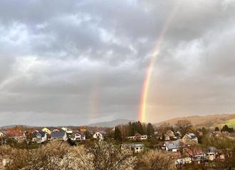 Der Schaumberg am Horizont, eingerahmt von einem doppelten Regenbogen. Blick von der Friedhofstraße in Thalexweiler.