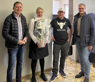 Bürgermeister Klauspeter Brill (re.) und Wirtschaftsförderer Roman Werth (li.) gratulierten Katja und Sebastian Schwinn zur Neueröffnung. Foto: Sakautzky/Stadt