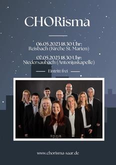 Am Samstag, den 6. Mai (Pfarrkirche St. Marien Reisbach) und Sonntag, den 7. Mai (Antoniuskapelle Niedersaubach), jeweils um 18:30 Uhr ist es soweit: Dann präsentiert das saarländische Vokalensemble Chorisma unter der Leitung von Eric Paulus sein diesjähriges Konzertprogramm und lädt ganz herzlich zu diesen beiden Konzerten ein.