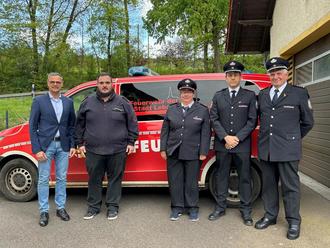 von links: Bürgermeister Klauspeter Brill, Benjamin Gouverneur, Elfi Gouverneur, Löschbe-zirksführer Oliver Brück und Wehrführer Hans Kartes. Foto: Melanie Bösen