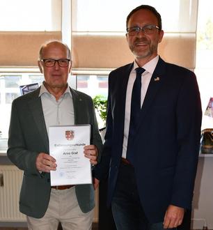 In Vertretung von Bürgermeister Klauspeter Brill überreichte der Erste Beigeordnete der Stadt Lebach, Markus Schu, dem Verwaltungsdirektor Arno Graf die Entlassungsurkunde. Schu sprach ihm für seine treue Dienste Dank und Anerkennung aus.
