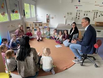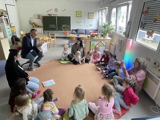 Der Lebacher Bürgermeister Klauspeter Brill hat den Kindern der Kita St. Barbara in Landsweiler am „Welttag des Buches“ die Geschichte von „Swimmy“, einem kleinen schwarzen Fisch, der inmitten eines Schwarms roter Fische lebt, vorgelesen. Die Kinder lauschten gespannt den Abenteuern des kleinen Swimmy, die er in den Tiefen des Ozeans erlebt.