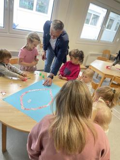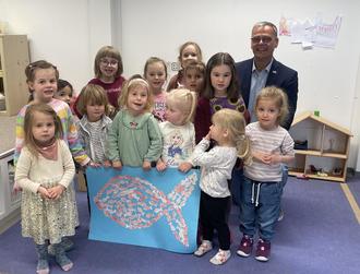 Nach dem Vorlesen wurde noch gemeinsam gebastelt. Es wurden ganz viele kleine Fische rot angemalt und aufgeklebt. Wie im Bilderbuch, als sich die kleinen Fische aus Angst vor größeren Fischen zu einem großen roten Fisch und mit Swimmy als „Auge“ zusammentun. „Gemeinsam sind wir stark, auch wenn wir klein sind“ lautete das Fazit der Geschichte und des Vormittags in der Kita. Denn für einen oder eine alleine wäre das Basteln eine stundenlange Aufgabe gewesen, zusammen war das ganz schnell geschafft und hat noch dazu allen Beteiligten sehr viel Spaß gemacht.