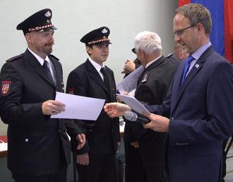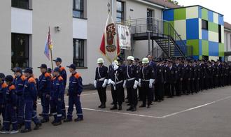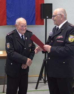 Nach der Messe marschierte die Wehr in einem feierlichen Zug zur Mehrzweckhalle, wo der offizielle Teil des Tages stattfand. Der Erste Beigeordnete Markus Schu nahm stellvertretend für Bürgermeister Klauspeter Brill Ehrungen für langjährige Dienstzeiten und besondere Verdienste sowie Beförderungen vor. Außerdem wurden altersbedingt Kameraden aus dem aktiven Dienst verabschiedet und in die Alterswehr aufgenommen.