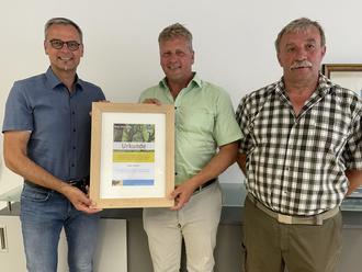 Im Beisein von Revierförster Winfried Fandel (re.) überreichte Dr. Helmut Wolf die Mitgliedsurkunde der Schutzgemeinschaft Deutscher Wald an Bürgermeister Klauspeter Brill. Foto: Kirsch/Stadt