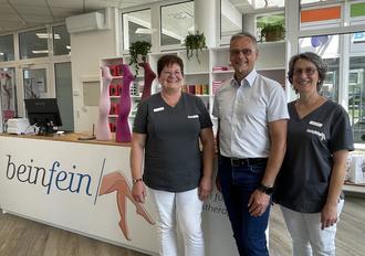 Lebach hat einen neuen Spezialisten für Kompressionstherapie. In der City-Passage (Marktstraße 24 - ehemals Molly Chic, unweit Bäckerei Bost) hat Anfang Juni „beinfein“ eröffnet. Der Spezialist mit über 25 Jahren Erfahrung in Venen-, Lip- und Lymphkompression hat neben seinem Hauptgeschäft in Saarlouis eine weitere Filiale in Lebach eröffnet, um näher am Kunden zu sein. „Bisher wird das Angebot sehr gut angenommen“, erklärt Geschäftsführerin und Orthopädietechnikmeisterin Petra Spengler beim Besuch von Lebachs Bürgermeister Klauspeter Brill und dem Geschäftsleitenden Beamten und Wirtschaftsförderer der Stadt Lebach Roman Werth.