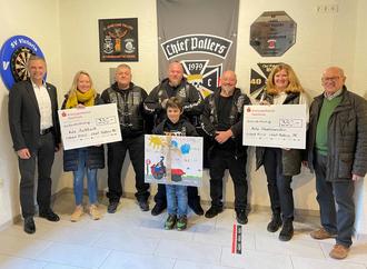 Da die Rocker auch ein Herz für Kinder haben, entschieden sie sich – gemeinsam mit dem Sportverein – dafür, alle Einnahmen und zusätzliche Spenden, die an der Eröffnungsparty zusammengekommen sind, an die städtischen Kitas vor Ort zu spenden. So konnten sich die Leiterinnen Yvonne Petri (Aschbach) und Manuela Zimmer (Thalexweiler) über einen Spendenscheck von jeweils 350 Euro freuen. Als Dankeschön erhielten die Chief Pallers ein ganz besonderes Motorrad-Bild, das die Kinder der beiden Kitas in Gemeinschaftsproduktion gemalt haben.
