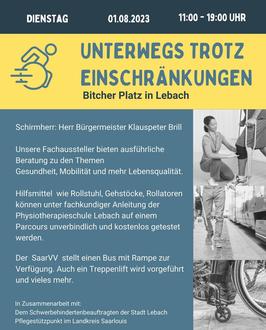 Gemeinsam mit dem Schwerbehindertenbeauftragten Pascal Borr und dem Pflegestützpunkt im Landkreis Saarlouis veranstaltet die Stadt Lebach (Sachgebiet Jugend, Senioren und Frauen) einen Mobilitätstag unter dem Motto „Unterwegs trotz Einschränkungen“.