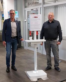 Bürgermeister Klauspeter Brill (links) und Arno Riehm, der Leiter der Stabsstelle Informationstechnik, Digitalisierung und Datenschutz (rechts) haben das Self-Service-Terminal im Foyer des Lebacher Rathauses in Betrieb genommen. Foto: Meng/Stadt
