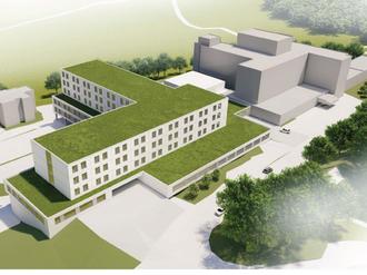 Durch die effiziente Planung des Ersatzneubaus werden alle medizinischen Funktionsbereiche im Erdgeschoss eingeplant. In den drei Stockwerken darüber werden die neuen Bettenstationen eingerichtet. Grafik: Kühn Architekten