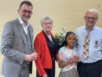 von links: Innenminister Reinhold Jost, Theresia und Rudi Fuchs mit Enkeltochter Marie-Raphael. Fotos: Kirsch/Stadt