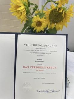 Seit über 60 Jahren engagiert sich der Steinbacher für das Gemeinwohl, in verschiedenen Vereinen und Institutionen, im kommunalen, parteipolitischen und kirchlichen Bereich. „Es ist schwer, das Wirken einer Person wie Rudi Fuchs nachzuzeichnen“, sagte Innenminister Reinhold Jost, der ihm im Namen des Bundespräsidenten das Bundesverdienstkreuz verlieh: „Das Verdienstkreuz am Bande ist die höchste Anerkennung, die die Bundesrepublik Deutschland für Verdienste um das Gemeinwohl verleiht. Und selten ist es so passend, von Gemeinwohl zu sprechen wie im Fall von Rudi Fuchs.“