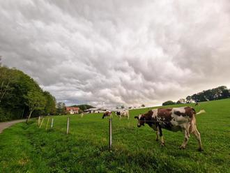 Dunkle Wolken am Himmel. Die Kühe vom Kinne Hof in Dörsdorf scheinen unbeeindruckt davon zu sein.